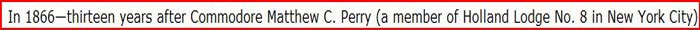دوستان توجه داشته باشند این تاریخچه از زبان خود فراماسونرهای ژاپن و طرفداران انها هست براحتی میتوانید تفکر استقلال فراماسونری در این مطلب را ببینید به دلایل زیاد قابل اعتماد نمی باشد. آنها در گفته های خود از فرامسونرها به عنوان نجات دهنده دنیا و مخصوصا ژاپن سخن میگویند و تاکید میکنند نظم و پیشرفت امروز ژاپن به خاطر آنهاست البته باید توجه داشت ورود دریادار پری یک واقعیت تاریخی است همیشه در ژاپن خود را یک نمونه انسان فداکار میدانند و اینگونه تبلیغ میکنند