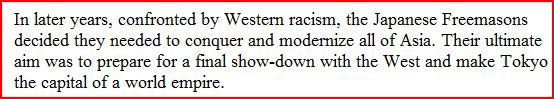 دوستان عزیز توجه داشته باشند که این تاریخ توسط خود ماسون ها و تعداد کمی غیر ماسون ها (که آنها هم باید به دیده شک نگریسته شوند) نوشته شده است در هر حال نکته مهم وجود فرماسونری حداقل به مدت 300 سال در ژاپن میباشد این گروه همزمان با حمله برادر غربی خود هیتلر شروع به جنگ برای برقراری نظم مورد نظر درآسیا کردند.