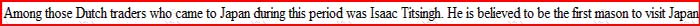 اولین فراماسونری ها هم از همان استعمار گران پرتغالی بودند شخصی بود بنام اIsaac Titsingh ین شخص طی سالهای 1779 تا 1783 سه بار به ژاپن سفر کرد و در این دیدار با سران و مقامات بالا رتبه ژاپنی دیدار داشته است. این شخص تحت پوشش کمپانی هند شرقی معروف این دیدار ها را انجام میداده است این شخص گنجینه ای از اطلاعات خاصی را از فرهنگ و جامعه ژاپن به اروپا برد